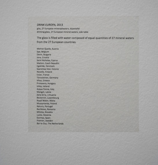 A glass is filled with water composed of equal quantities of mixed mineral waters (the most popular mineral water bottle is chosen from each country, Evian from France, San Benedetto from Iraly, Loutraki from Greece, Bar-Le-Duc from Netherlands, Selters from Germany, Bosec from Roumania…) from the 28 European countries.