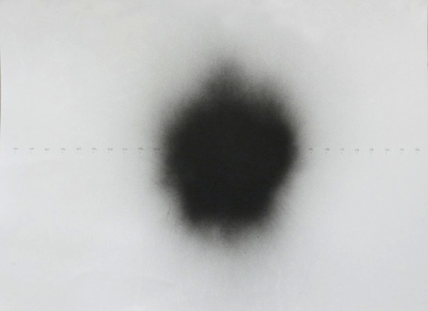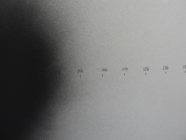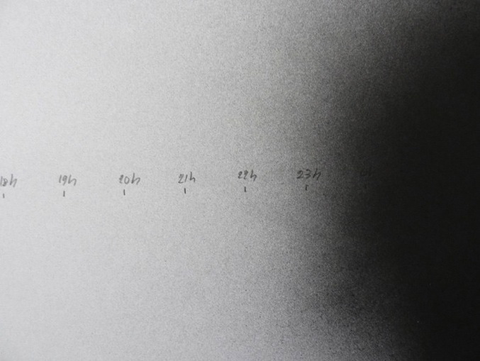 (The time slept is erased from the white day, each night produces a new drawing) Views of three nights cartography, (8/1/12, 9/1/12 and 10/1/12), carbon and black spray on paper, 50x70 cm each / All the nights since 2011 are being archived...Ongoing serie.