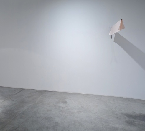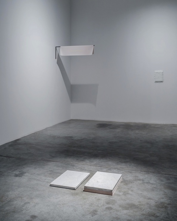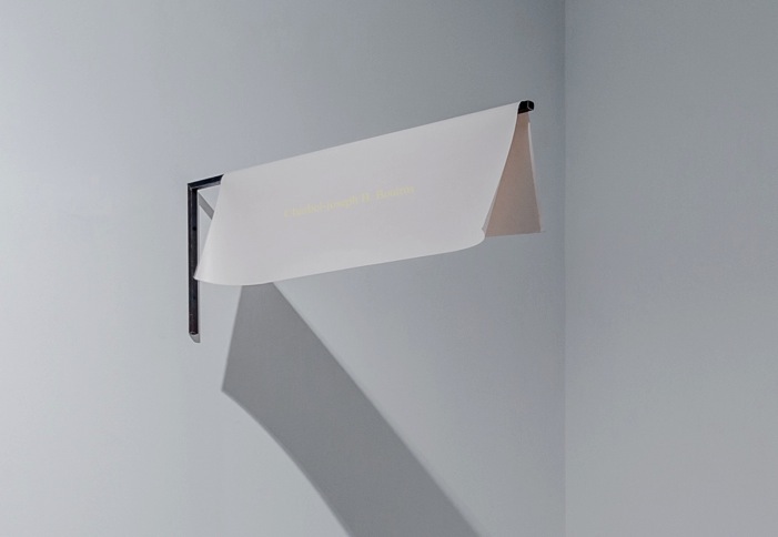 2016, metallic bracket, newspaper print, sun of 18.9.2016, dimensions variable / The artist’s name is written by the sun of his birthday using a stencil system.