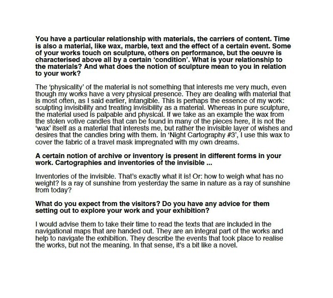 Je voudrais aussi réagir à tes remarques qui m’ont interpellé. Je citerais les expressions suivantes : « une forme de déclinaison imperceptible », en évoquant la question de l’invisibilité ; « transformation silencieuse ». Dans ce travail, c’est vrai que tu vois un homme lire. Ce qui se passe, est imperceptible. Cette dimension me permet d’aller vers l’invisibilité. Toutes mes pièces aboutissent à quelque chose de l’ordre de l’invisible. Elles démarrent toutes d’un élément de la réalité : je ne vais jamais chercher quelque chose d’exceptionnel pour commencer une pièce. Elles relèvent du quotidien : un calendrier, la nuit, le sel, le sucre, l’eau. Elles appartiennent à notre réalité qui est très vite transcendée. Toute ma recherche porte sur une esthétique de l’invisible. Mes pièces semblent minimales, mais elles ouvrent d’autres portes. Il y a un lien avec Duchamp, avec cette volonté de Duchamp de se libérer du rétinien. Or, je constate, en ce moment, que la forme des choses - leur physicalité, leur matérialité - fait un grand retour dans l'art contemporain. Peut-être est-ce lié à la puissance du marché de l’art ? J’essaie de m’éloigner le plus possible de cela. Mon œuvre propose un paysage mental. Je souhaite échapper à la réalité en proposant une autre poétique qui dépasse notre quotidien. Je souhaite aussi échapper à ce grand marché de l’art, même si on en fait tous partie. L’œuvre peut appartenir à un musée, à une collection, mais la dimension immatérielle qu’elle contient est impalpable. Elle ne t’appartient jamais. C’est juste une enveloppe - une coquille - qui contient l’objet poétique.